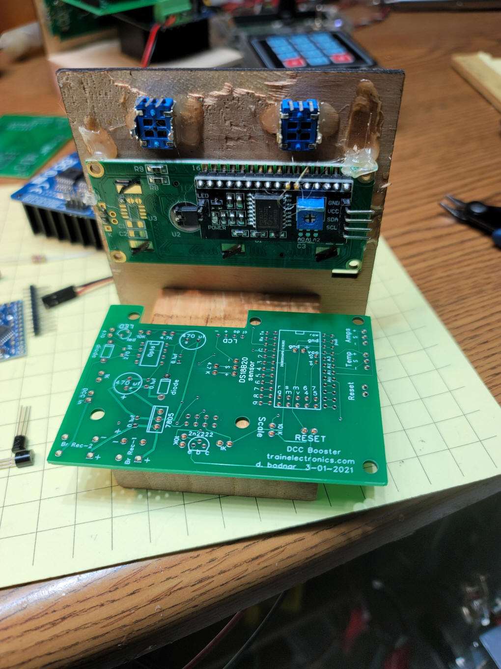 Building the Booster These photos should help you to build the booster The back of the mounting frame is shown here. The LCD display and two potentiometers are shown. This is the front view. The "Reset"