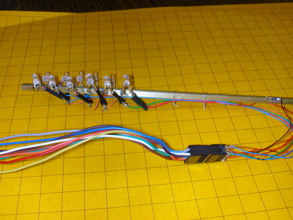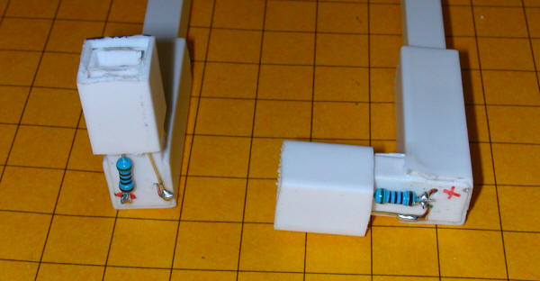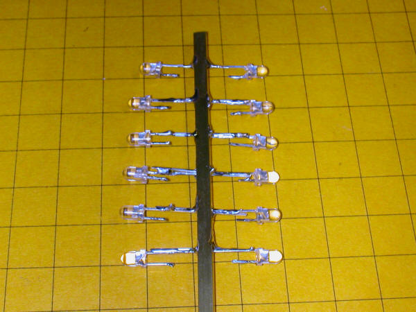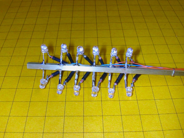 The negative lead from each LED is soldered directly to the square brass support in the center. Each positive lead has a 200 ohm 1/8 watt resistor soldered to it. This is needed to limit current to the LEDs.