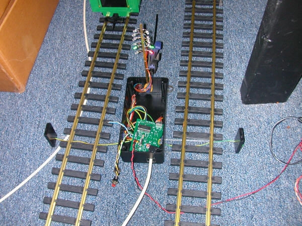 This view shows the start line. The two start sensors are at the top. The two black blocks in the center contain IR detectors while the outer two blocks contain IR LEDs. The Christmas tree connector is shown at the very top.