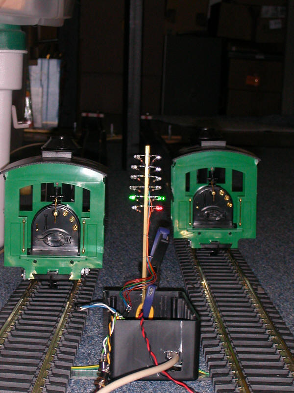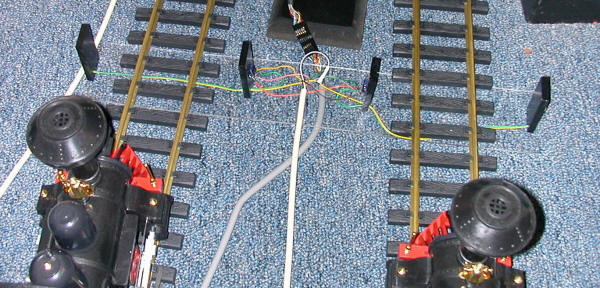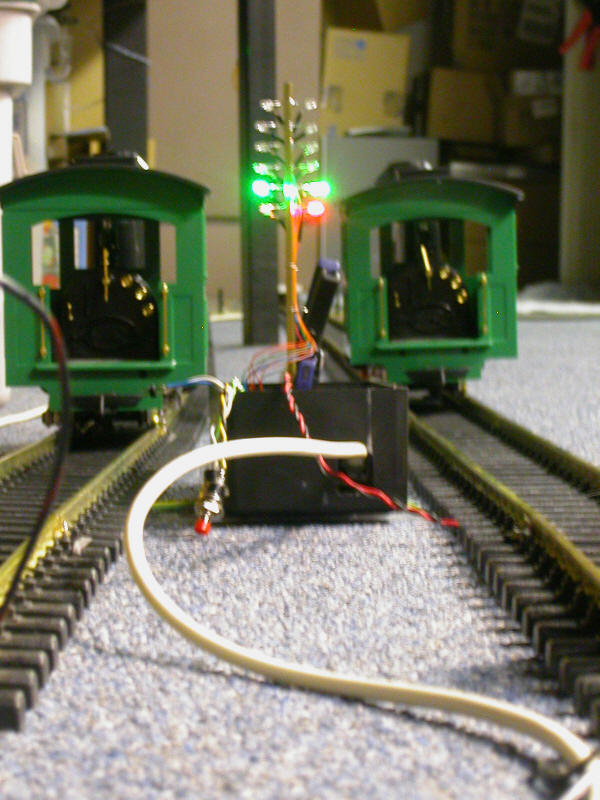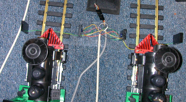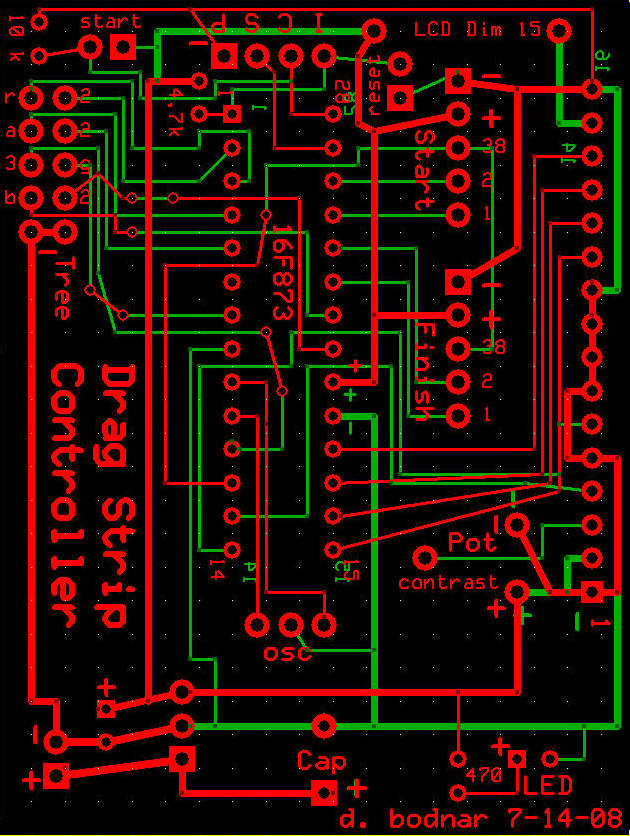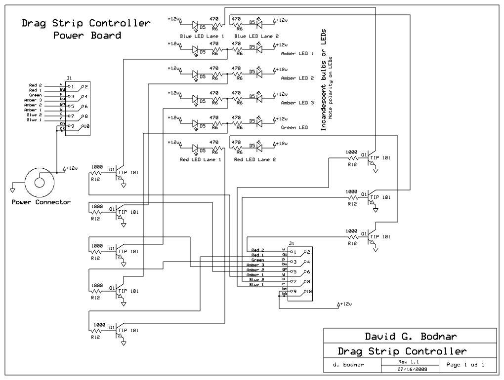 Operational Scenario Two parallel tracks are set up on a level surface. A few feet from one end a "Christmas Tree" light pole and two IR sensors are placed between the tracks. Near the other end of the track two more IR sensors are placed to determine the winner. Sufficient track is left after the end sensors to allow competitors to bring their engines to a safe stop. It is recommended that diodes be placed in the track to prevent trains from running off the end. A five conductor cable connects the far end sensors to the controller. A second five conductor cable connects the start sensors and a ten conductor cable connects the "Christmas Tree" lights to the controller. The controller itself connects to 7-12 volts DC and has two buttons on it, one labeled Start and one labeled Reset. A separate power supply that is appropriate for the voltage of the Christmas Tree's bulbs attaches directly to the lighting circuit. If LEDs are used for the Christmas Tree the same power supply that powers the controller can be used. Each track is connected to its own power supply. The competitors control starting and stopping of the engines and use the throttle to determine their speed. To start a race: