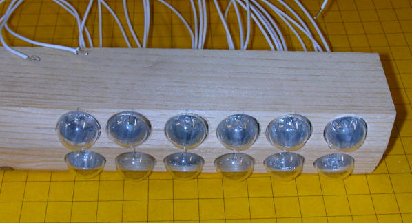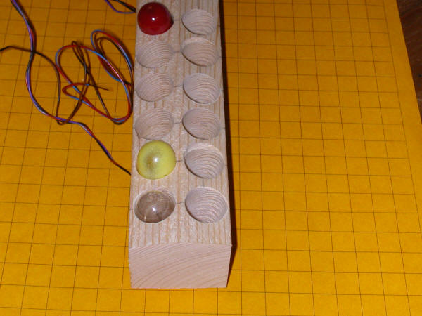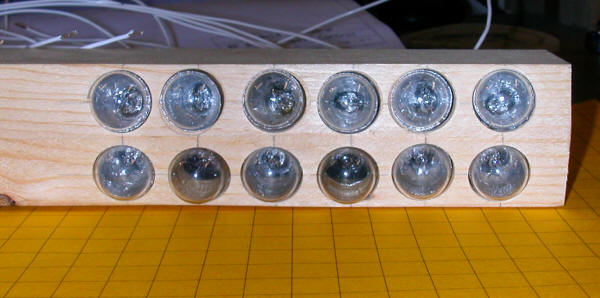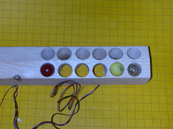 Incandescent Bulb "Christmas Tree" To allow proper testing of the circuitry with 12 volt "Malibu" type bulbs a wooden tree support was made from a scrap of 2" x 2" lumber. The face of the board that shows the bulbs has been tapered 10 degrees on each side so that the bulbs point towards one lane or the other.