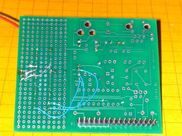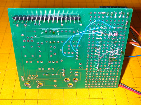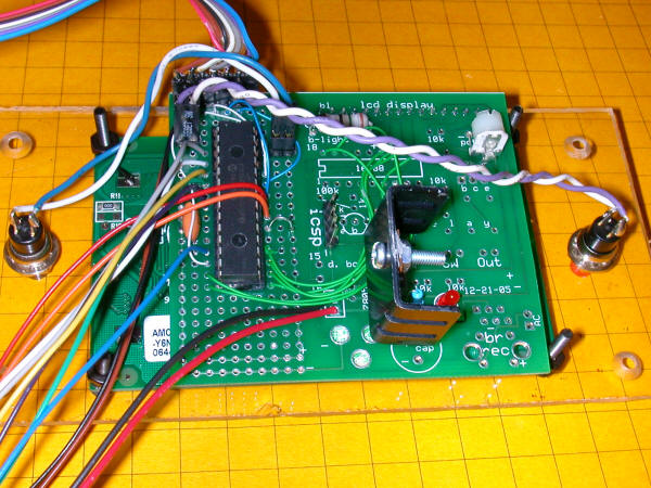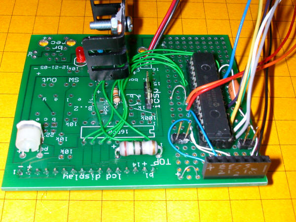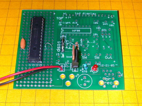 The components that are needed to drive the LCD display have been added in this photo. The pot in the upper right is used to adjust the display's contrast. The large resistor at top center is the current limiter for the backlight on the LCD.