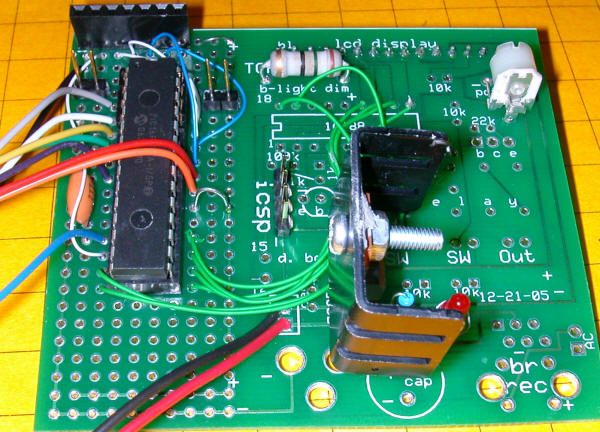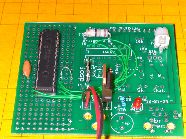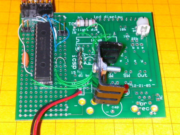 Latest Prototype Photos This unit utilizes a PIC 16f873A processor that is mounted on a prototyping area that I left to the side of some of my speedometer circuit boards. This allows quick prototyping as the right side of the board allows for quick connections to a regulated power supply and programming pins. The PIC is to the left - the device to its left is a 4 MHz resonator.