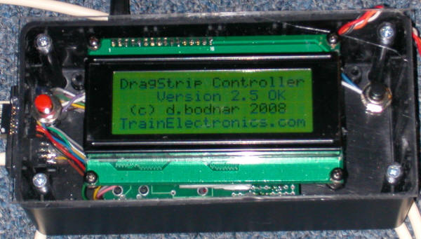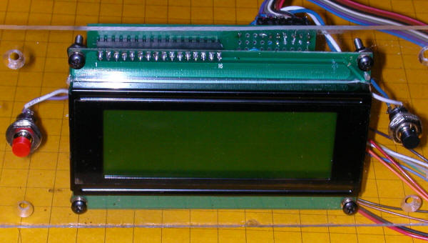 Here the LCD has been attached. The button (red on left) is RESET. The black button on the right is START.