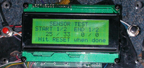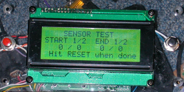 Sensor Test Routine A routine has been added that allows the operator to confirm that the two start and the two finish sensor are working properly. To access this routine press the "Start" button while the copyright screen is being displayed. The first set of zeros in the third line shows the number of times the test routine has gone through its loop while the sensor was being blocked. while the second set of zeros shows the end sensors.