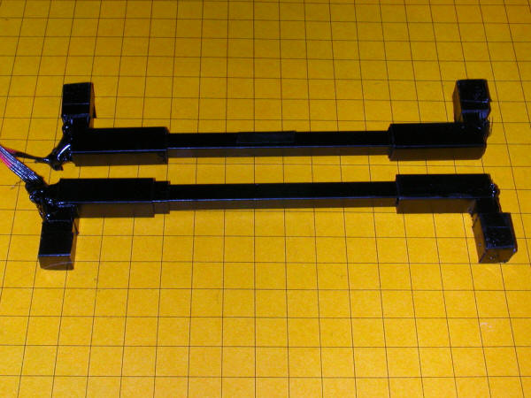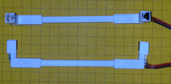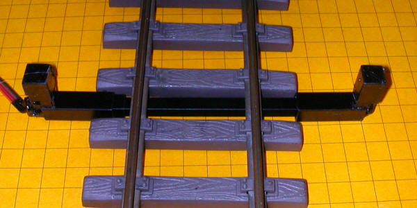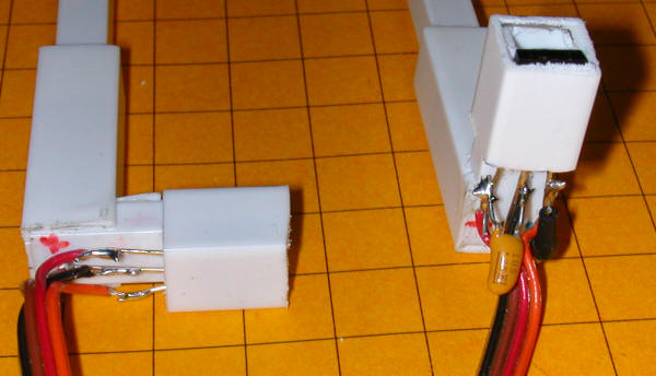 New Sensor Design A revised sensor design places the emitter and detector lower and farther to the side. This design also fits nicely between the ties. In this photo one sensor is shown. The emitter is to the right and the detector to the left.