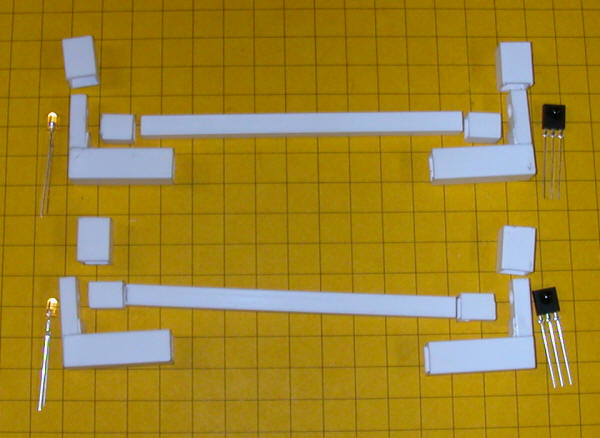 Each sensor is made of 9 pieces of styrene, one IR led and one IR detector. In this photo two pieces of styrene have been glued together to make a right angle piece.
