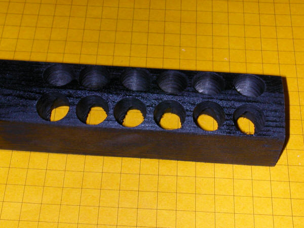 The taper can be seen more clearly in this photo. The holes were drilled with a 5/8" Forstner bit with the drill press table tilted to 10 degrees. The bulbs are just a bit over 1/2" in diameter so they easily fit in the holes in the block.