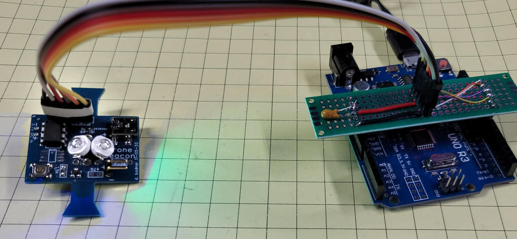 Simple Programmer Interface To simplify programming the Drone Beacon I set up the Arduino UNO programmer so that its six pin header (shown below) would plug right into the Drone Beacon board. Its wiring and construction are shown here: http://www.trainelectronics.com/Drone/ATTinyBeacon/ATTinyProgrammerExample.htm