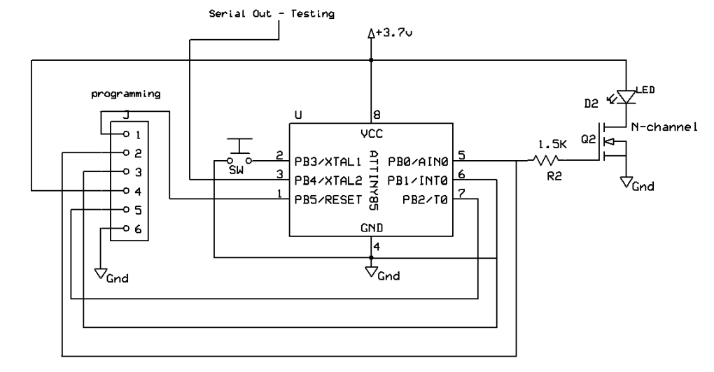 The Circuit The schematic is very similar to the one from the PIC 12F683. The main difference is to the programming wiring to the header labeled "programming". There is also a connection to pin 3 (PB4) that can be used to see the serial output as the unit blinks or progresses from one mode to another.