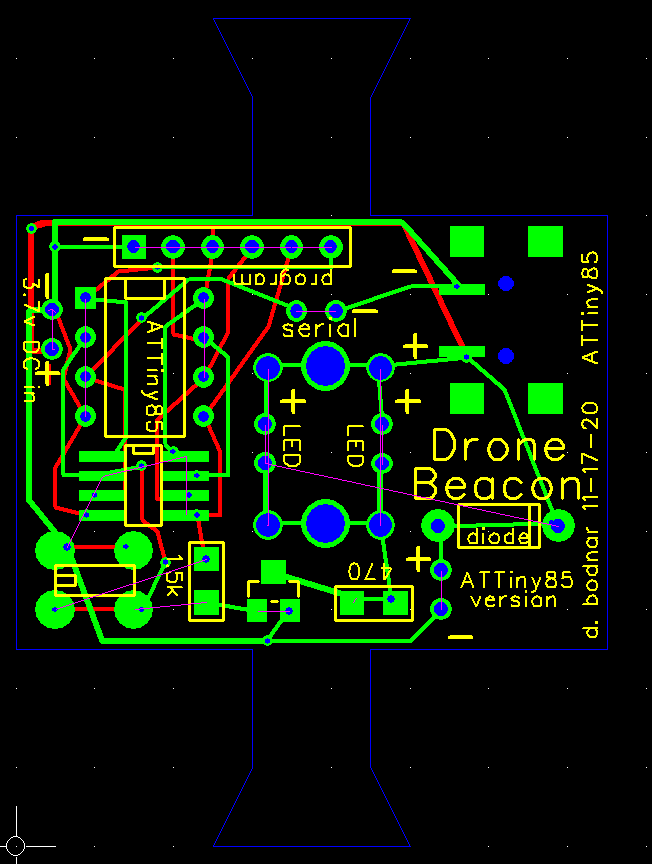 ATTiny85 Programmer I built a simple programmer for the ATTiny that utilizes an Arduino UNO, Detailed instructions on building this programmer are here: http://www.trainelectronics.com/Drone/ATTinyBeacon/ATTinyProgrammerExample.htm |
