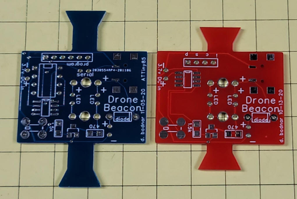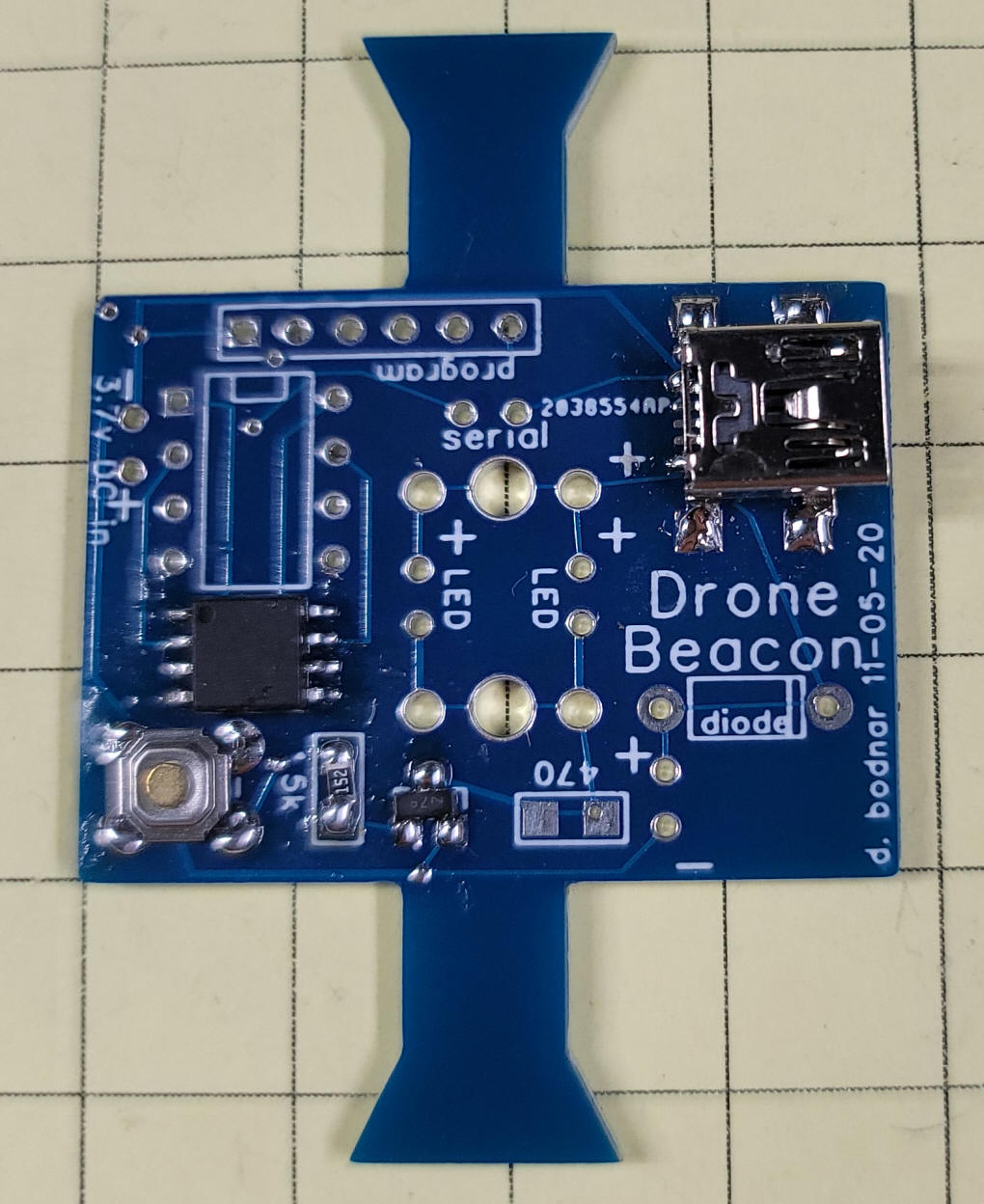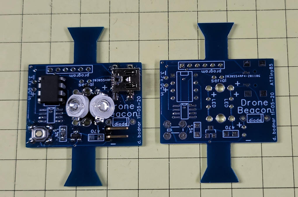 inexpensive and have an extensive support network on the Internet. The only problem that I find is that even the smallest Arduino is much larger than many of the PIC chips that I also use. If space is an issue I usually go for the PIC family of microprocessors. Recently I was working on a project where I wanted to make a small circuit to flash a bright LED beacon to help follow a drone in flight. I designed and built the circuit using a small, surface mount 8 pin PIC chip and wondered if I could make an equally small circuit using an Arduino. A few years ago I had experimented with an 8 pin ATTiny85 chip that could be programmed using the Arduino IDE (programming environment). I decided to revisit that chip and to see if I could translate the program that I wrote in PIC BASIC PRO to the Arduino compiler's "C" so that I could use it with the ATTiny85. I also discovered that there is a surface mount version of the ATTiny85 that had the potential to give me a circuit that was as small as the PIC based unit.