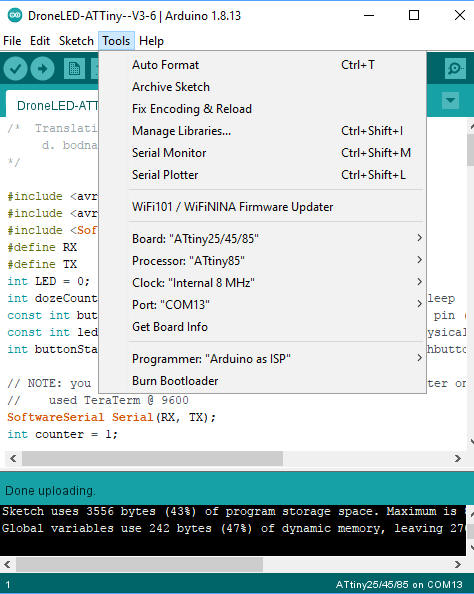 IMPORTANT - Burn Bootloader First Before you program the ATTiny85 make sure you click on "Burn Bootloader", the last option in the screen shown here. Once that is done you can program the ATTiny85.