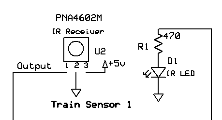 One of the design objectives for this project was to allow across-the-track and reflective sensors to be used interchangeably. This creates a problem that needs to be addressed either by changing the hardware or the software since the detector reacts differently in the two types of sensors. When the emitter and detector pair are configured for across-the-track operation the output pin on the PNA4602A is normally high, showing +5 volts, when a train is not present. This is because it is always exposed to the infrared from the emitter. The output pin goes low, showing 0 volts, only when a train passes. On the other hand, the reflective sensor sees no infrared from the emitter until a train passes so the normal status of the output pin is 0 volts. It briefly shows +5 volts on the output pin when a passing train reflects infrared light back into the detector.