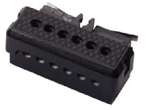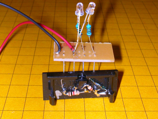 Introduction A few months ago Noel Widdifield contacted me about helping him to connect a set of 10 signal crossing lights to each of his 10 turnouts so that the appropriate LED would light indicating the orientation of the switch. The signals were from Shiloh Signals. Each signal contained one green and one red LED. After corresponding with the folks at Shiloh I found that each signal had 3 wires coming from it. One wire goes to the cathode of the red LED, one wire goes to the cathode of the green LED and one wire connects to both of the anodes of the LEDs which are connected together within the signal. In a setup like this you simply connect the positive voltage from your DC power supply to the common anode lead and connect the negative terminal to the cathode of the LED that you want to light. This type of LED wiring is called, for obvious reasons, "common anode" wiring. As mentioned above, we would have used LGB's 1203 units had they been readily available. Since we could not find a source for ten 1203's other methods were explored. How LGB's Switch Unit Works The LGB 1203 is a DPDT (Double Pole Double Throw) add-on device that attaches directly to the end of the LGB turnout motor. It is made up of two identical SPDT (Single Pole Double Throw) switches that are thrown one way or the other depending on the switch motor's position. To install this unit a cover pops off of the end of the switch motor and the 1203 is added. As one would expect there are six wire connection terminals on the 1203. Two terminals are common, two are normally open and two are normally closed.