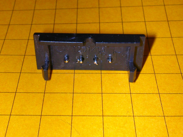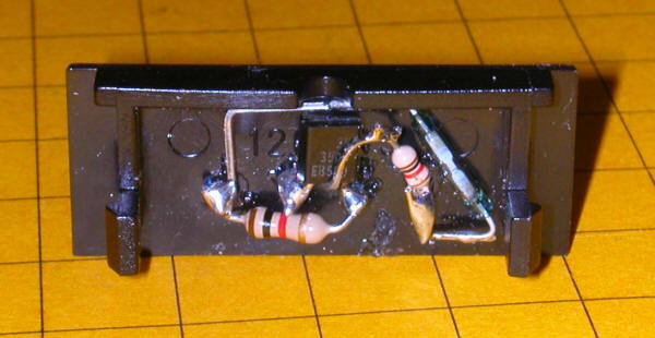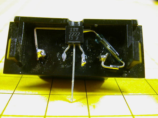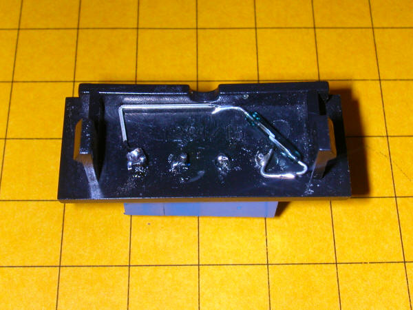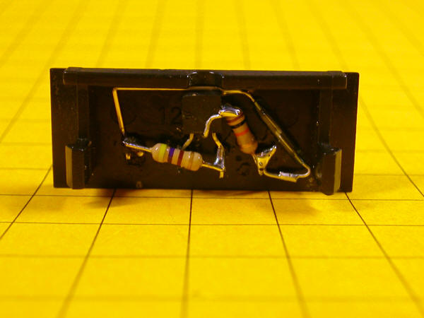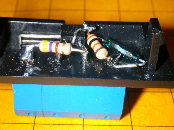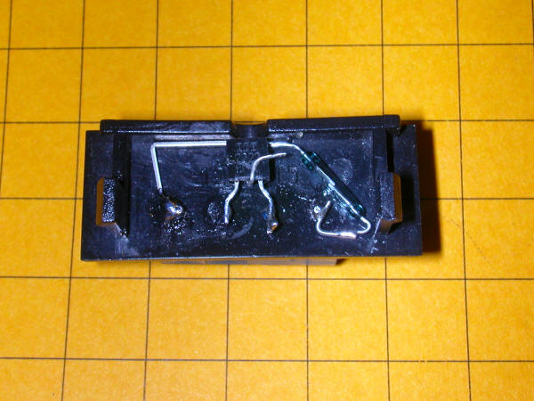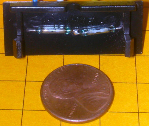 This is a view of the inside of the turnout motor cover showing the two reed switches that, when wired together, comprise a SPDT switch. If you look carefully you will note that the two inner contacts are soldered together.