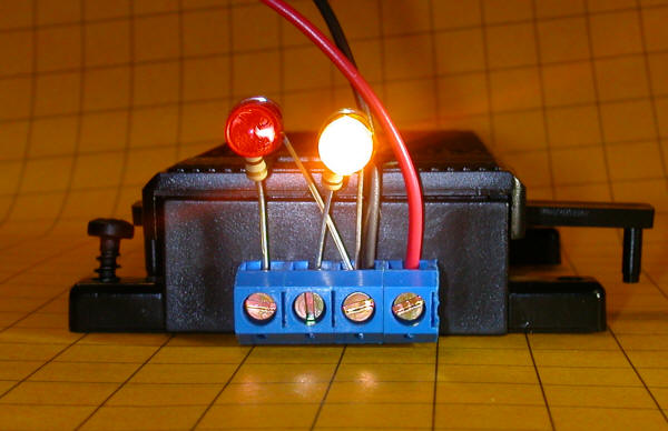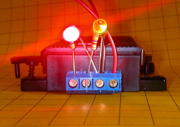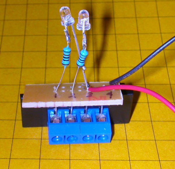 Wiring with Two Reed Switches The wiring diagram below shows how the signal lights are wired if two reed switches are installed inside of the switch motor. The two reed switches are wired together so that they act as a single SPDT switch. When the magnet moves to one side switch SW1 is turned on and SW2 is off. When it moves to the other side SW1 is off and SW2 is on. The 1000 ohm current limiting resistors (R1 and R2) are installed within the signals themselves. The parts to the left of the 4 terminal connector are inside of the end plate on the switch motor. The terminal block is installed on the outside of the end plate. Here we see two test LEDs and the red & black connections that supply 12 volts DC.