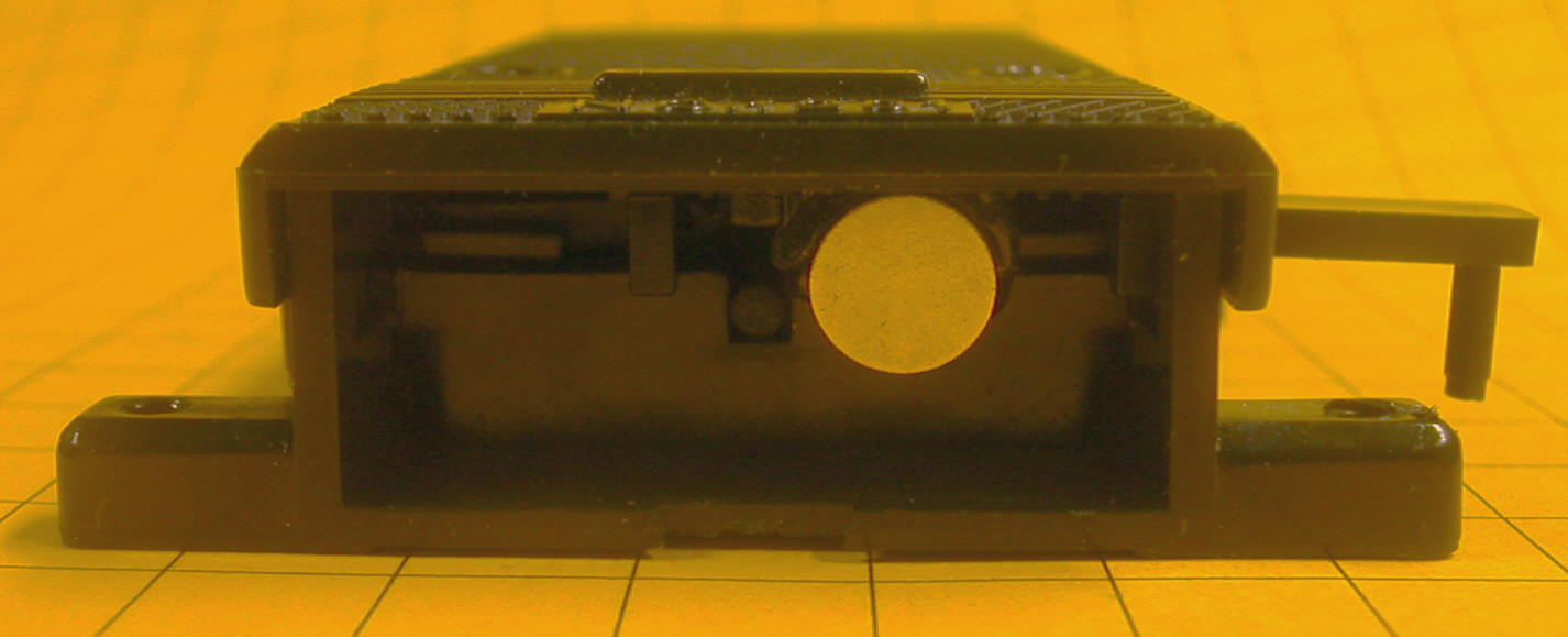 The only other modification to the switch motor is the addition of a small permanent magnet to the arm that moves inside of the switch motor. This arm moves left or right when the switch is thrown. In this photo the magnet is the silver object to the right of center. Note that the switch throw arm is also to the right. When the switch throws the other way the arm and magnet both move to the left. The magnet is glued to the center of the movable arm with a small amount of epoxy.