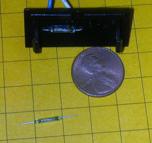 Alternatives to Using the 1203 A number of alternatives were explored when seeking a solution to this problem. Among them were using small SPDT micro switches similar to those used by LGB. Since we are only interested in controlling one signal light (containing 2 LEDs) a single SPDT switch is all that is necessary. Although small switches are available this solution was rejected due to the difficulty in aligning the switch properly so that it reliably indicated the position of the switch. The preferred solution uses one or two magnetic reed switches. Some reed switches are so small that they can easily be installed inside of the end of the LGB switch motor. This allowed us to use the cover that is normally removed when the 1203 is installed to mount the reed switches and any other components. In this photo you see the end plate from an LGB switch motor that has a small reed switch mounted on it. Another reed switch is below the penny. Note that this end plate is included with every LGB switch motor and is normally removed and discarded when the 1203 is added.