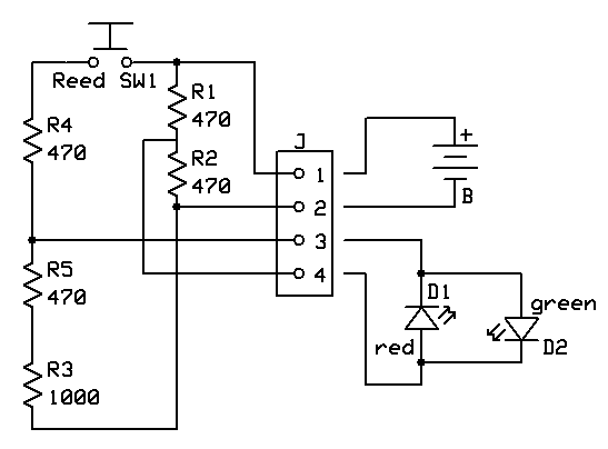 Only three of the four wires from the signal are connected to the circuit. This is due to the wires from cathodes of the two LEDs being tied together at the signal. Note that this wire and the negative terminal of the battery or power supply both go to connection #2. The positive power connection goes to #1. If the LEDs do not light in the proper order, that is if the red LED lights when the green one should be lit, just switch the connections at #3 and #4. Another Wiring Solution The above circuit uses two reed switches to make up a SPDT switch. I found that both reed switches can be activated if the magnet that is glued to the movable arm is too strong. A more reliable system uses only one reed switch that can be placed far to one side of the base plate. The wiring diagram below shows how it is wired. The parts to the left of the 4 terminal connector are inside of the end plate on the switch motor. Resistors R1 and R2 make up a voltage divider that supplies approximately 1/2 of the supply voltage to terminal 4. Note that the two LEDs are wired in parallel with anode to cathode and cathode to anode. Resistors R3, R4 and R5 are current limiting resistors. Their values can be modified if the LEDs have internal current limiting resistors. When reed switch SW1 is open the red LED lights. When SW1 is closed the green LED is lit.