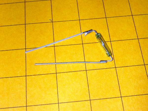 5. Carefully bend the leads on the reed switch. DO NOT bend while holding the glass body of the reed switch. It WILL shatter! Always bend while holding the wire with pliers.