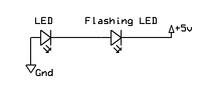 This diagram shows how you can wire a flashing and a non flashing LED so both of them flash together. It really couldn't be much simpler since most of the flashing LEDs don't even need a current limiting resistor if you supply them with 5 volts. Nothing more is needed than the two LEDs, wired in series anode to cathode, and power.