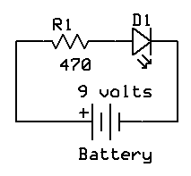 In theory one should mathematically or experimentally determine the proper current limiting resistor for a particular LED being supplied with a particular voltage. In reality a 470 ohm to 1000 ohm resistor will work with just about any LED for any voltage we are likely to use in garden railroading. There is a simple circuit that you can make that takes advantage of this fact and will safely test most LEDs. The test circuit that I use most often is battery operated and consists of just a few parts. This illustration below shows the schematic for the tester. The LED is labeled D1. Its anode goes to the left and its cathode goes to the right. R1 is the 470 ohm current limiting resistor. The 9 volt battery is at the bottom with its positive terminal to the left.