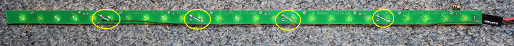 Here is what needs to be done to rewire each board. First cut the two traces that connect each 5 LED segment as shown here. I used a small tip Dremel drill bit to grind the traces away. This needs to be done four times.