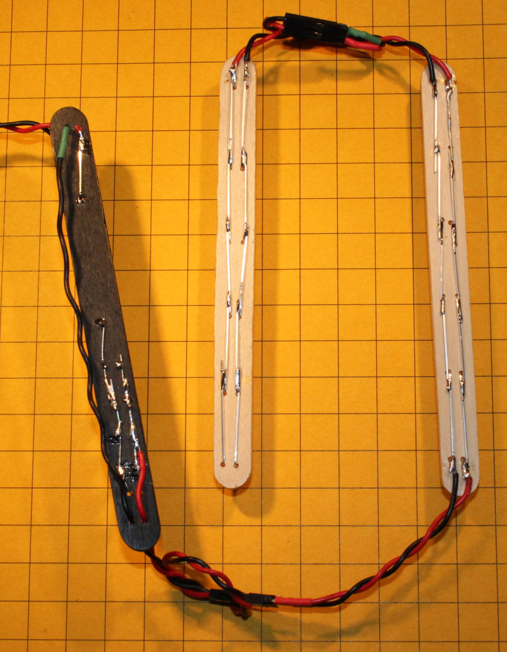| Test Setup - LED Boards The test LEDs are mounted on popsicle sticks. Circuit boards could, and will, be used but using popsicle sticks is a great alternative when you are experimenting and don't want to wait for circuit boards to be fabricated! Here is the test setup showing two LED boards, a resistor test board (in black) and 4 AA NiMH cells for power. The three striped objects near the center are additional resistors that will be plugged into the sockets on the black popsicle stick to adjust brightness.
