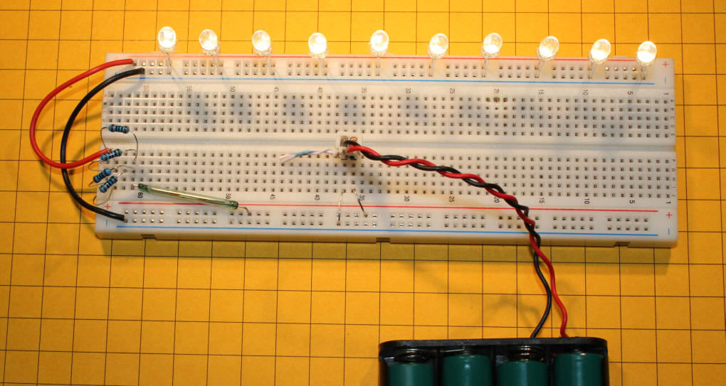 | An Alternative Test Setup Rather than using popsicle sticks you can also make a test unit that is functionally identical to the one above using a prototyping board. The resistors are in the bottom left along with the latching reed switch. The LEDs are plugged into the power bus at the top.