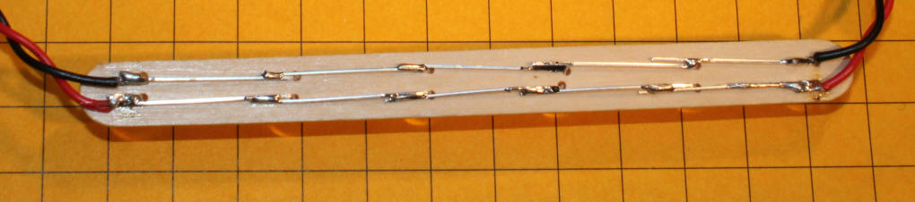Push the leads through the holes making sure that the LEDs are all aligned with the same orientation, that is with the longer leads (the positive anodes) together on one side and the sorter (negative cathodes) together on the other side. Bend the leads over as shown and solder them together so that the LEDs are wired in parallel. The cathodes (shorter leads) are at the top and wired to the black connecting wire. The anodes (longer leads) are at the bottom and connected to the red connecting wire. Red wire connects the anodes and black the cathodes. Two strips like the one below will give a total of 12 LEDs for testing.