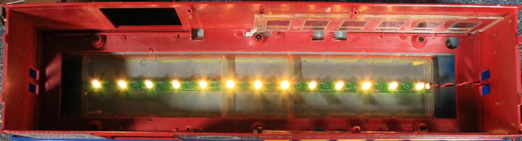 Here the LED circuit board has been mounted to the top of a coach. Thirteen of the 25 available LED locations on the board have been used. When 4.8 volts is used with a 33 ohm resistor it gives a very realistic looking effect. A photo of this car when seen from the outside is at the beginning of the article.