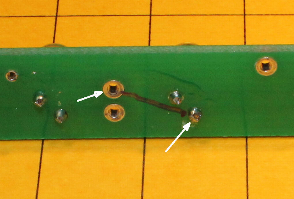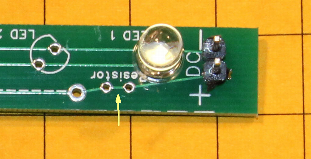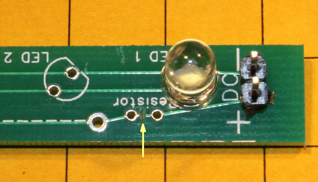 The yellow arrow points to the trace that connects, and bypasses, the resistor mounting holes.