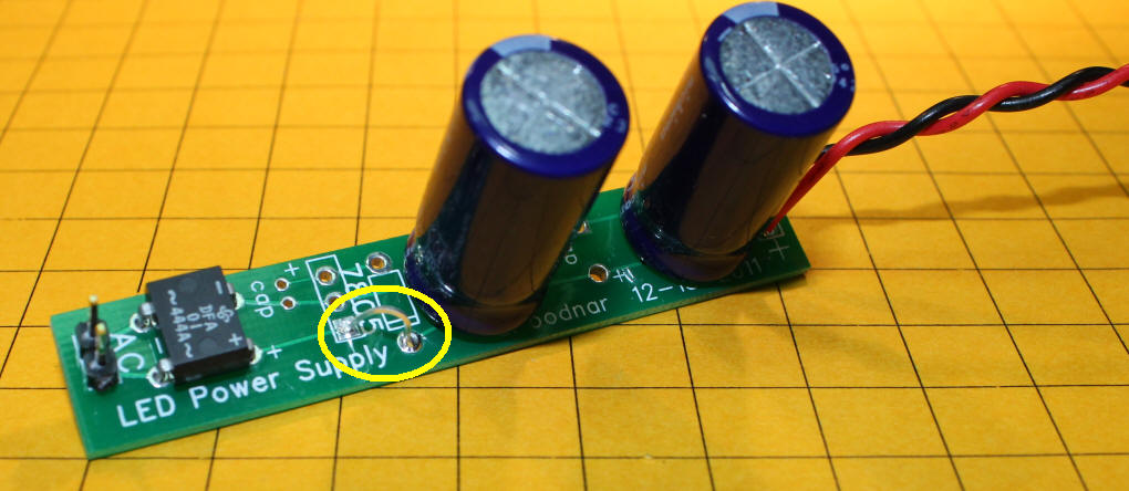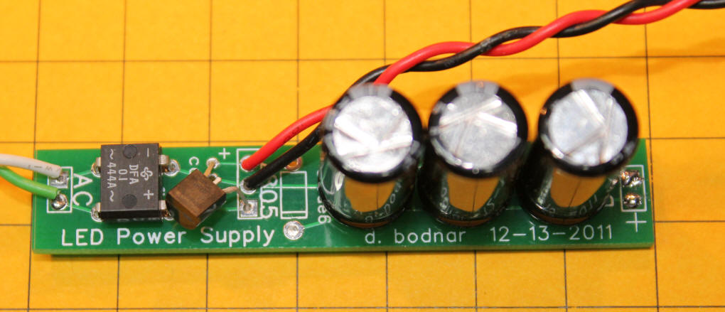 The completed board works very well with input voltages above 17 volts. I watched the current consumption as I increased voltage and installed a current limiting resistor to keep the current draw from the whole board to about 100 ma. This supplies about 20 ma to each LED. At 18 volts a 10 ohm resistor did the trick when used with all 25 LEDs. I also built up a small power supply board so that I could supply power to the LEDs from DCC track power. Only three components are used, a bridge rectifier and two capacitors. The voltage regulator is not needed as we want the full DCC voltage to arrive at the LEDs. A jumper (yellow oval) connects the input pin from the 7805 to the positive lead that goes to the capacitors. I used two 680 uF / 50 volt capacitors. Make sure that the voltage rating on the caps is at least 25 volts, preferably 35 or more.