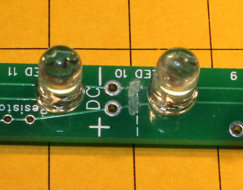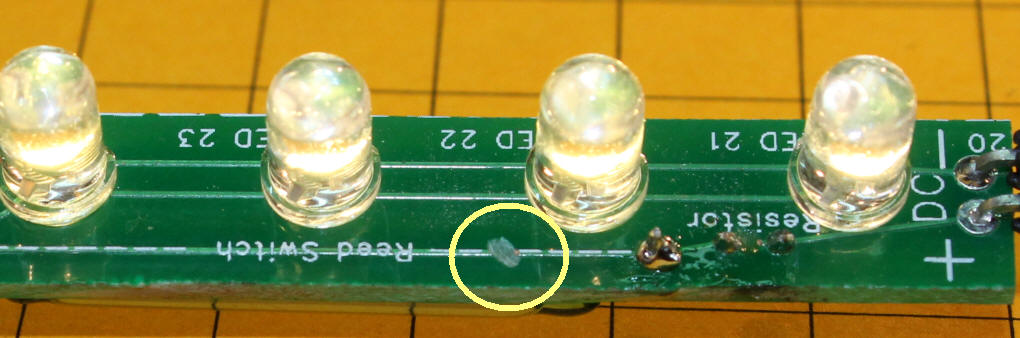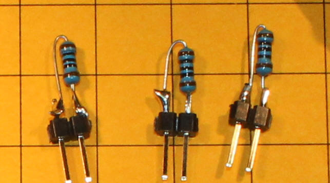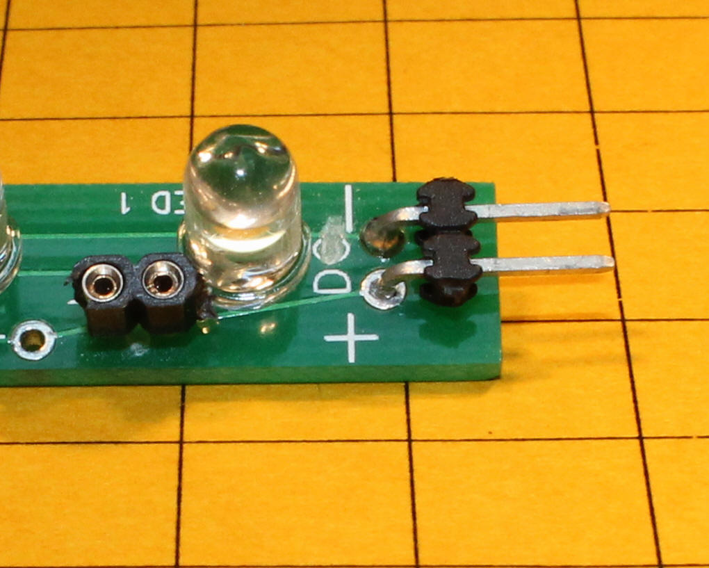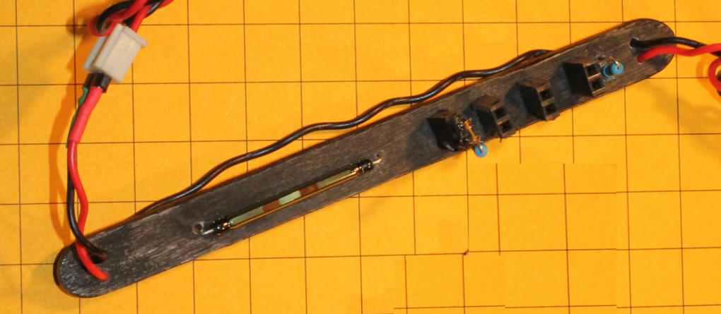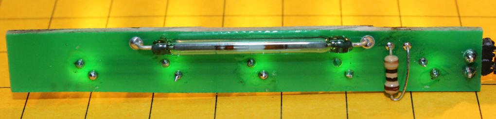 The latching reed switch is fragile and WILL break if you bend its leads without supporting the glass body of the switch. See the information towards the end of this article for tips on safely bending leads: http://www.trainelectronics.com/artcles/SENSORS_partI/index.htm . It explains that you MUST hold each lead close to the glass body of the switch with a pair of pliers as you bend the lead. To make the sockets for the resistors I used sections of plastic headers that can be purchased here: http://www.thaishine.com/servlet/the-790/10-pcs-1x40-Pin/Detail Just cut two pin sections out and mount them as shown. The resistors were soldered to matching headers: http://www.thaishine.com/servlet/the-793/10-pcs.-40-Pin/Detail As shown in the schematic, one 100 ohm resistor was permanently soldered in while the others can be inserted or removed as needed. If you don't want to take the time to deal with sockets and plug in resistors you could just as easily solder in additional resistors as you check LED brightness. Here is a close-up of the resistors.