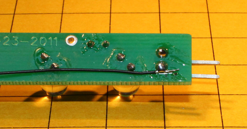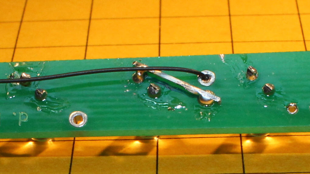 Here the jumper has been soldered to the board. This happens to be the last of four jumpers and it also shows the return wire that connects to the power input pins at the other end of the board.