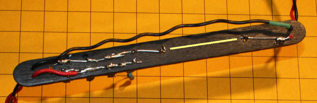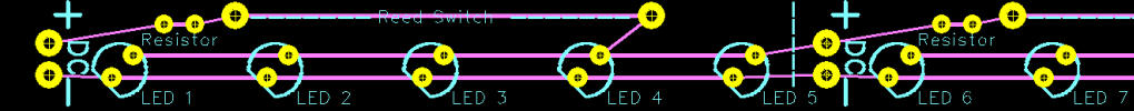 If a latching reed switch is to be used to turn the lights on and off you have to make a similar cut somewhere along the trace labeled "reed switch". Only the trace closest to the power input should be cut.