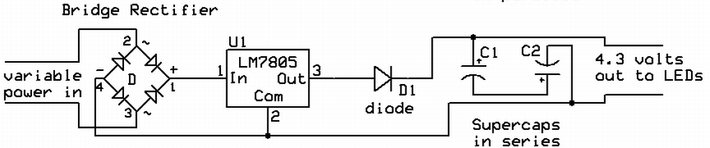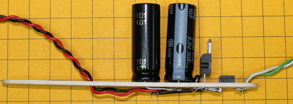 Here the three 2200 uF capacitors have been replaced with two 10F capacitors wired in series. They are wired in series because the voltage rating of these capacitors is only 2.3 volts and we are supplying 5 volts from the voltage regulator. The capacitors are wired in series with the positive lead from one going to the negative lead of the other, doubling their voltage to 4.6 volts but halving their capacitance to 5 F. The diode just after the 7805 drops the voltage another 0.7 volts to make sure we don't feed any more than 4.6 volts to the capacitors. You might not think that changing from 6600 uF to 5 F is much of a change in capacitance unless you know that there are 1,000,000 uF in a F (1,000,000 microfarads in a farad). This means the 5 F supercaps have 5,000,000 / 6600 = 757 times the capacity of the 6600 uF set of capacitors! These supercaps will keep the light shining for several minutes after the power has been removed. Supercaps are discussed in more detail in this article http://www.trainelectronics.com/Trolley_MrRogers/lights