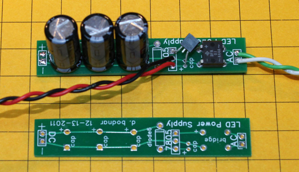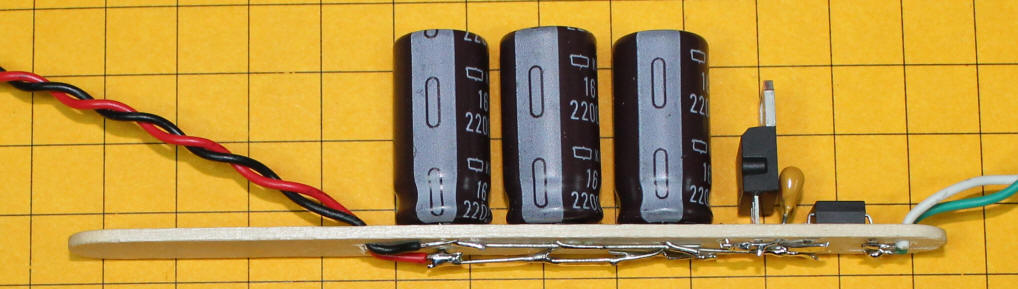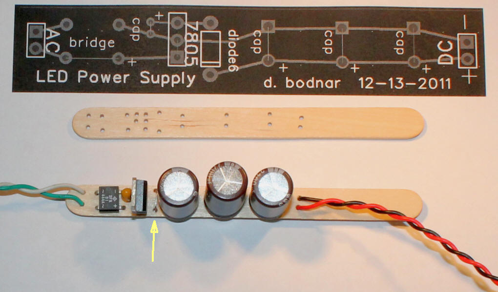 Track Power The top part of the photo below shows a drawing of a circuit board that I designed. While awaiting its arrival I made up a sample that is functionally identical using a popsicle stick. The first stick is drilled and the second is populated with (from left to right) a bridge rectifier, a small filter capacitor, a 7805 regulator, a small jumper (see yellow arrow) that takes the place of a diode and three 16volt, 2200 uF capacitors. The diode is not needed unless you are using special "supercaps" that are discussed below. In this case I just used a short jumper in its place.