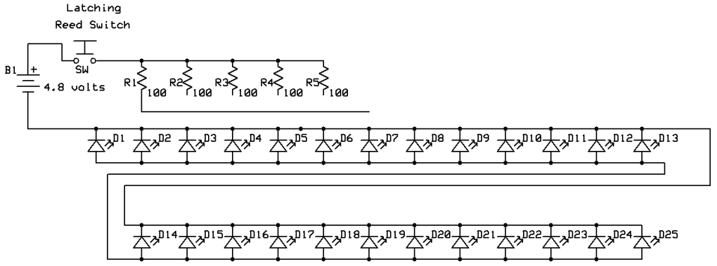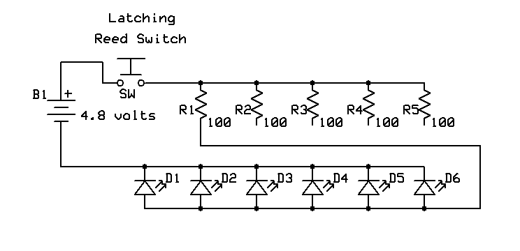 | Testing Connect the power board to one or more LED strips. You should see each LED light up, but somewhat dimly, when you pass the magnet close to the latching reed switch. If any or all LEDs are not lit check to see that they are all mounted with their anodes together and their cathodes together. You can also put a temporary jumper across the pins of the reed switch to make sure that power is getting through it. Add additional resistors, one at a time, until a good balance between brightness and current consumed is reached. When I used this setup with 12 LEDs the single 100 ohm resistor only allowed a current of 20 ma to flow. The table below shows the power that is provided as more resistors are placed in parallel.
