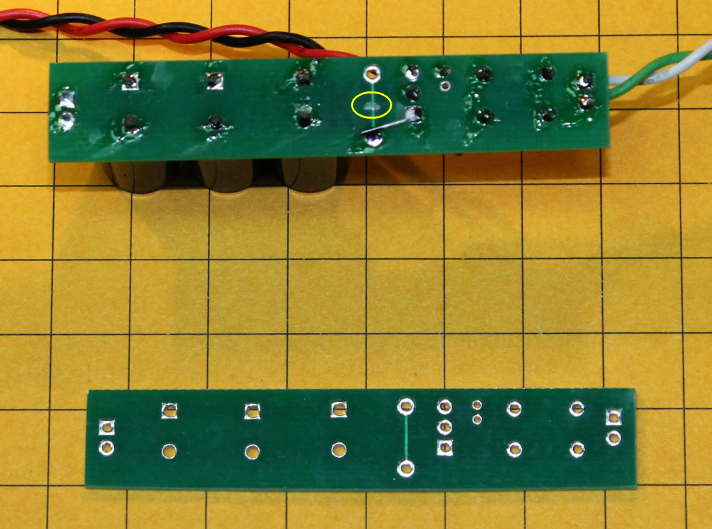Here the trace between the resistor holes has been cut so that a resistor can be mounted in the holes.