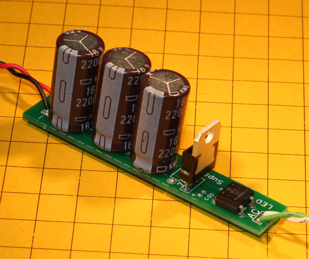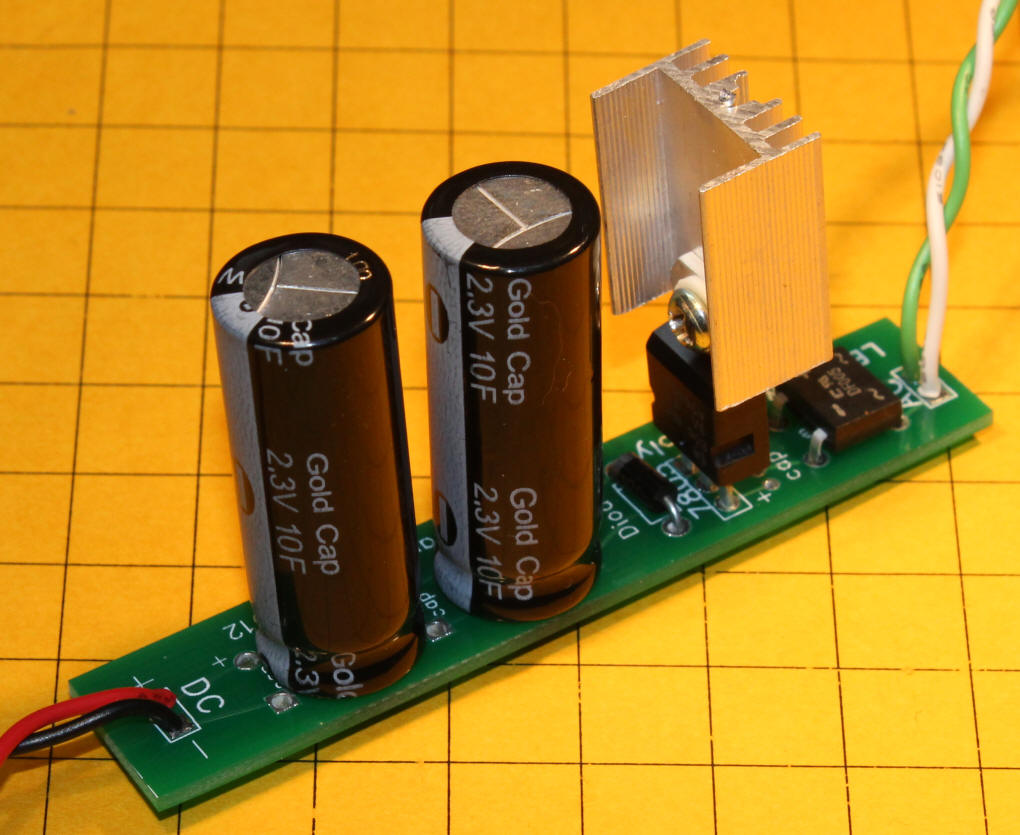 Here is another view of the same board. There are three 2200 uF / 16 volt capacitors wired in parallel. When capacitors are wired in this way their capacitance is added so they behave as though we are using one 6600 uF capacitor. This may sound like a high value but 6600 uF is only enough power storage to keep the LEDs from flickering, not enough to keep them lit for any length of time beyond a second or two if power is completely lost. To accomplish that we need to employ SUPERCAPS.