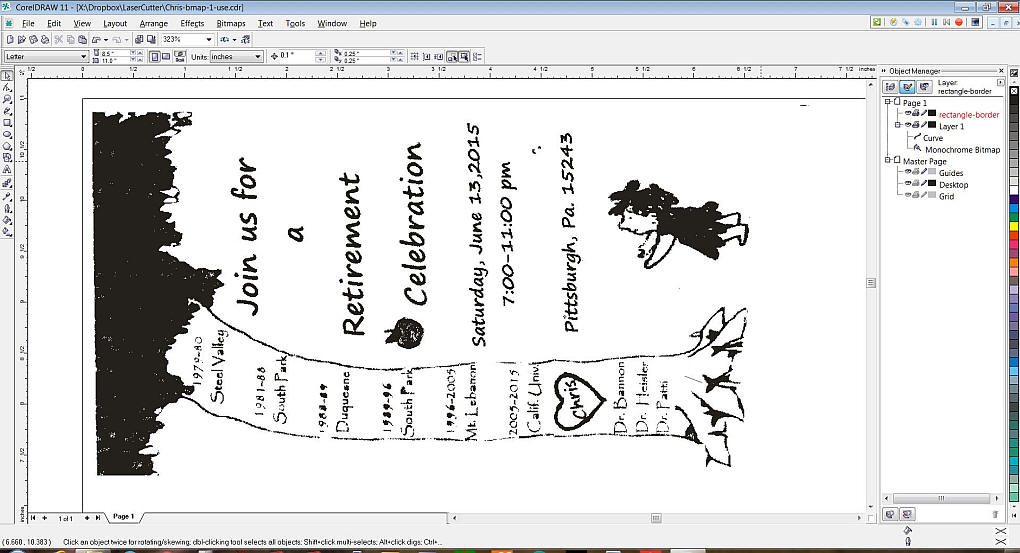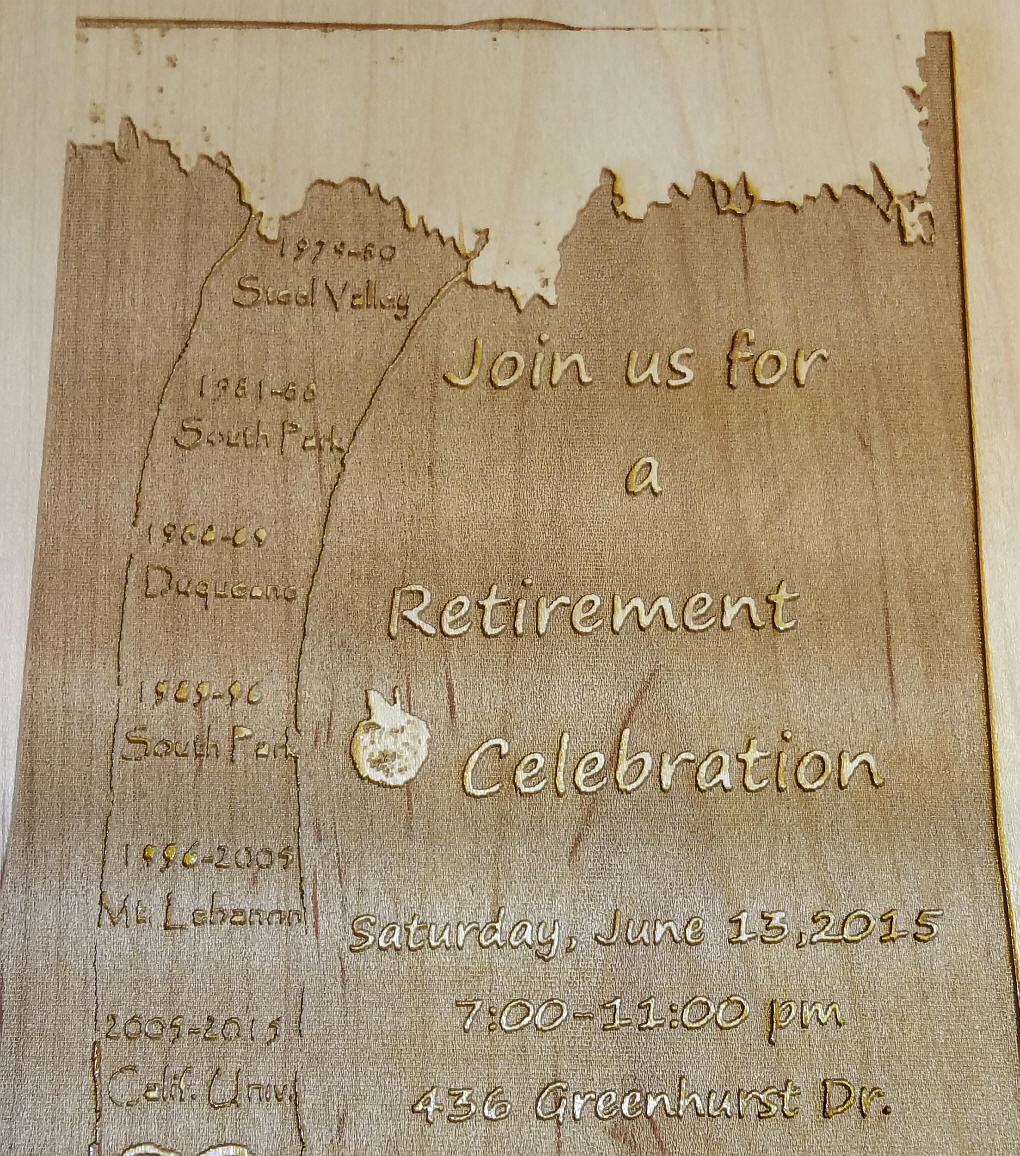 Engraving Although not its strong suit as this unit will not do grey scale engraved images, you can make a very acceptable engraving in acrylic or wood. I experimented with making up an engraving of an invitation that I got for a friend's retirement party. Here is a portion of that invitation I started by scanning the image as a JPG