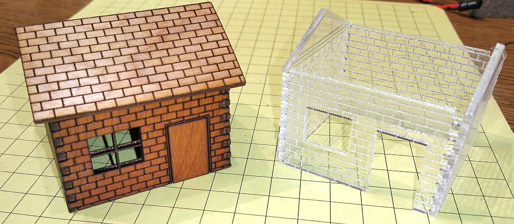Down for HO Scale The only manual adjustment were making the mutton bars in the windows slightly wider to make them less prone to breaking and lengthening the "fingers" on each corner as the 1/8" material I used for the HO building was more than 25% as thick as what I used for the G building. The shed on the left was done on thin plywood that had been stained and varnished and the one on the right on 1/8" acrylic. It was nice to prove that scaling down was not an issue, especially with vector based drawings.