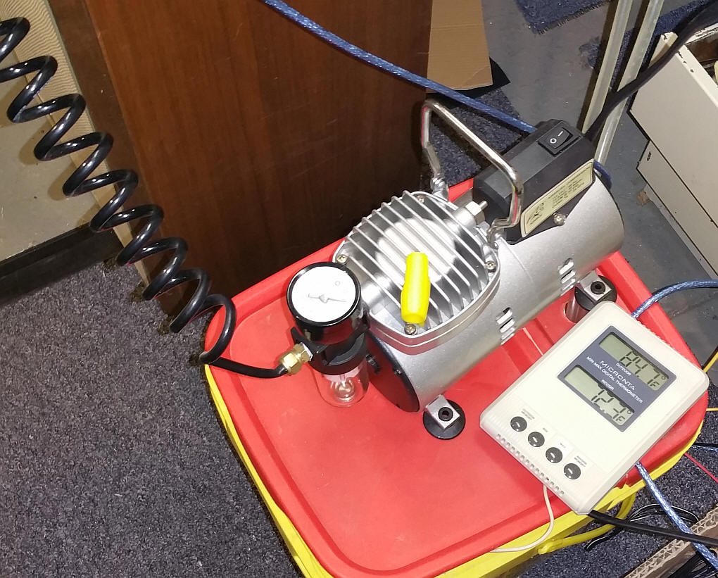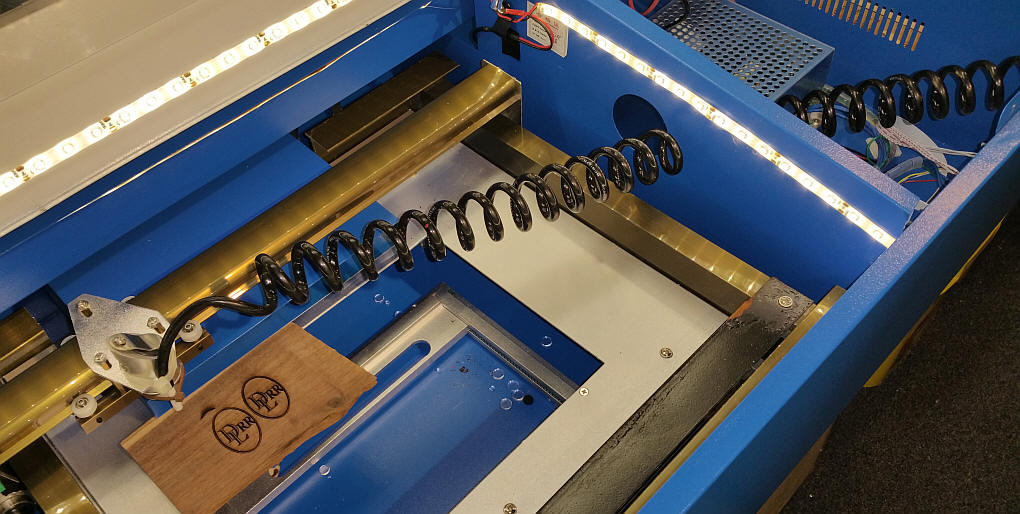 Using an Air Jet to Clear Smoke Some engravers / cutters come with a small air compressor and lines to help clear smoke from the area that is being hit with the laser. This can remove some contaminants that can mar the finish of the material. This unit does not come with such an accessory but it can easily be added. I had a compressor and flexible lines from an airbrush. The only down side is the noise from the compressor! I simply removed the fitting on the air line and pressed a small piece of tubing into it. Then I used cable ties to hold it to the print head on the laser. It does help to remove contaminants and gives a better print. |