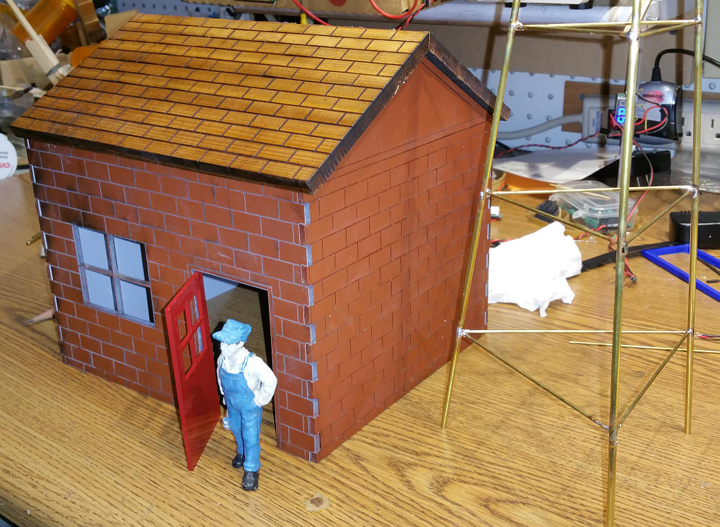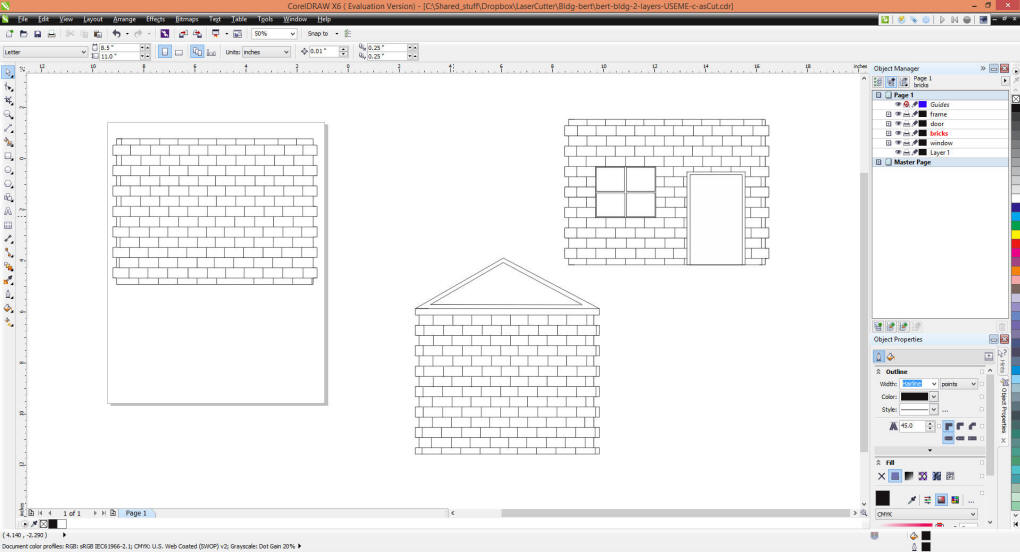 G-Scale Shed I designed a small shed for a G-scale layout and engraved and cut the four pieces. I did a number of passes doing the grout lines for the block walls at a power setting of 5 and the outline at 15. Even at that power level it took a few repeats over the outline to completely free each side from the rectangle of acrylic. I designed the shed using CorelDraw. The frame, bricks and windows/door were each put on a separate layer so that I could selectively show or hide each for cutting.
