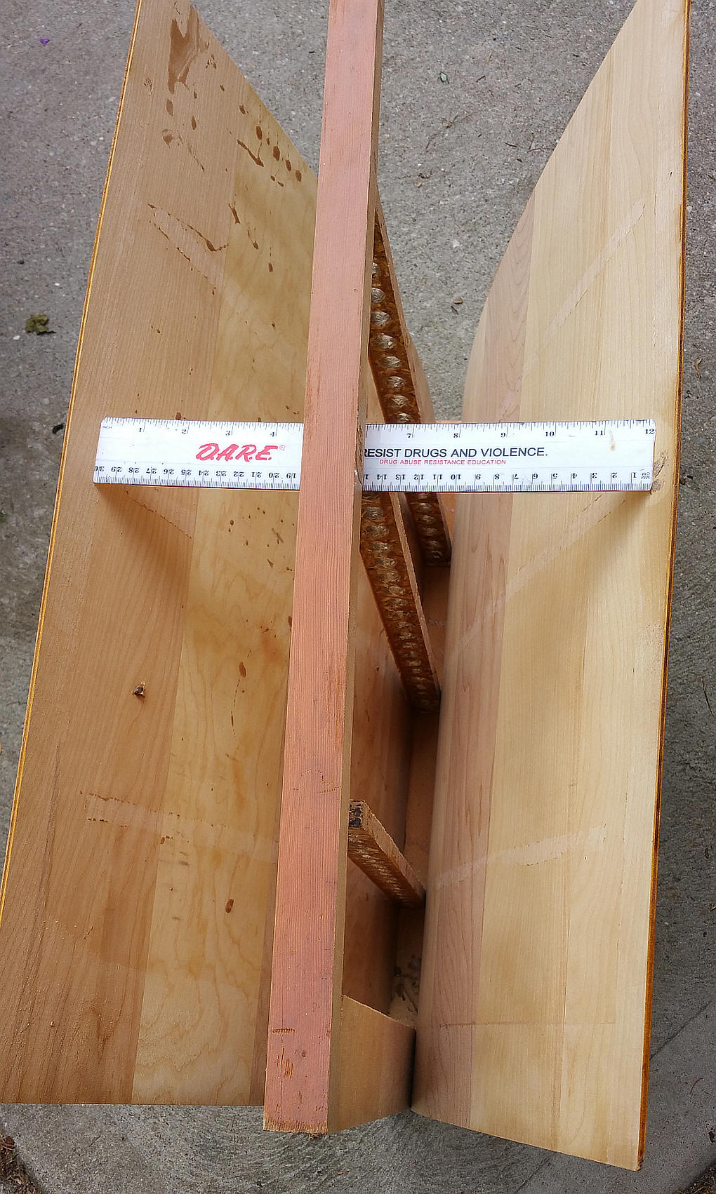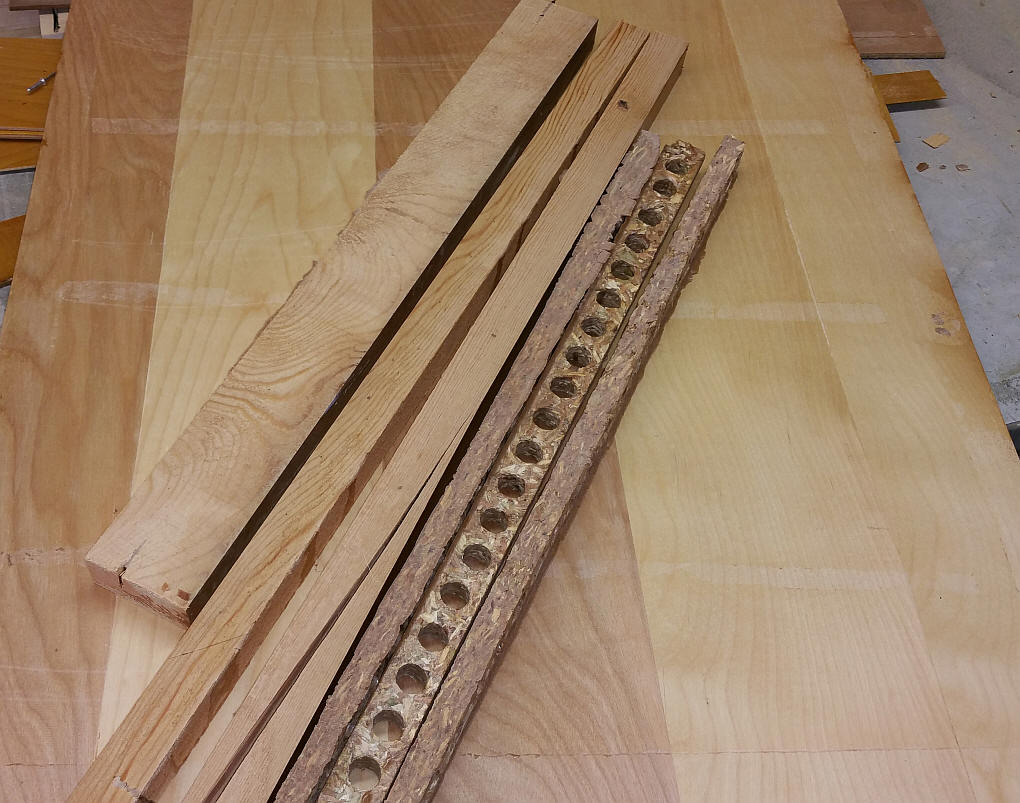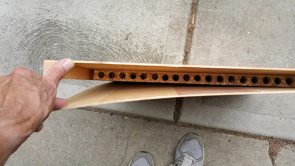 I needed a large (4' diameter), light weight platform. I made it from two hollow core doors that were bolted together and cut into the circle. The left over door material was set aside for some time till I realized that it could be used for lots of projects. When I got the laser cutter it was one of the first things that I used for cutting and engraving. To get your own supply of hollow core door plywood you need to locate a building materials recycler - the one in Pittsburgh is called Construction Junction. There I can pick up used hollow core doors for $5.00 each. With a little work each can be turned into 25 or more square feet of plywood. I first cut the doors into thirds to make them easier to handle. I then try to pull the two faces apart. If the door is old (many I have found are) and the glue has dried out you will be able to do so. Inside you will find some sort of spacer like the perforated chip-board material that you see in the photo above. If I can't just pry them apart I use my table saw to cut off the bottom and top edges and the sides. These parts are solid wood so that hinges and door hardware can be added. Here is a door with dried out glue that just released the inner bonds and gave up the plywood skin. Very little glue remained and that was easily removed with a swipe with a chisel. Here you see the innards of one 1/3 hollow core door. Not a bad collection of plywood for my projects! |