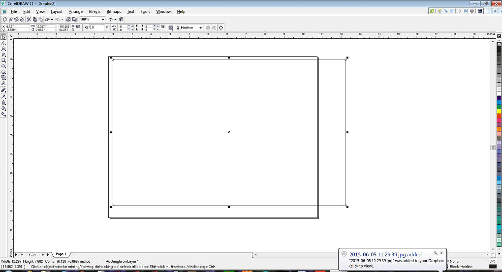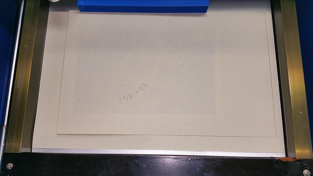 Max Print Size I did some tests to see just how big an item can be cut or engraved. The screen below shows the CorelDraw setup. The page is set to landscape orientation and the rectangle that it will print is beyond the page edge. Here a piece of legal paper was laid into the print area and the above rectangle was printed. It wound up being 7 5/8" x 12 1/4". I suppose that a bit of fiddling might get a slightly larger print but this is pretty good. |
