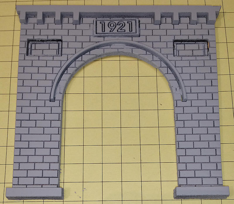 and traced around it. and added bricks (stone?). Note that the bricks extend beyond the outline. That was the easiest way to place them and the parts that are beyond the outline will be cut off by the cutter. The small index mark (circled in red) assures that all layers are in the right place. I make sure that I include the index mark in all layer prints. The portal was cut from 1/8" plywood salvaged from an old hollow core door. Note that the arch detail and the boxes and details at the top are raised to give more of a 3D effect. A light coat of grey primer and it is ready to install. I don't really think the boxes on either side of the date add much and will likely remove them from the next version.