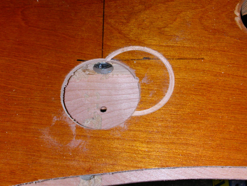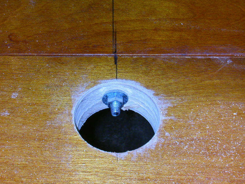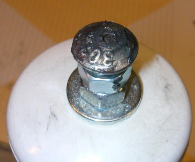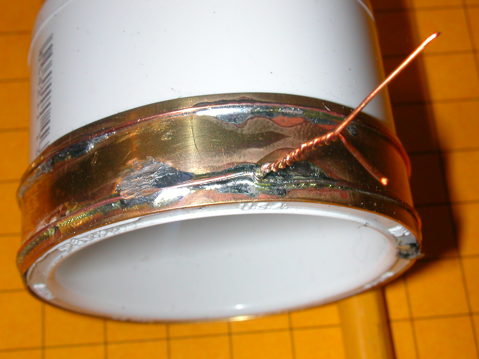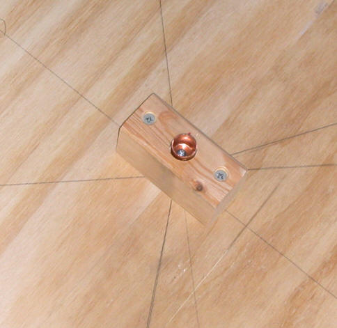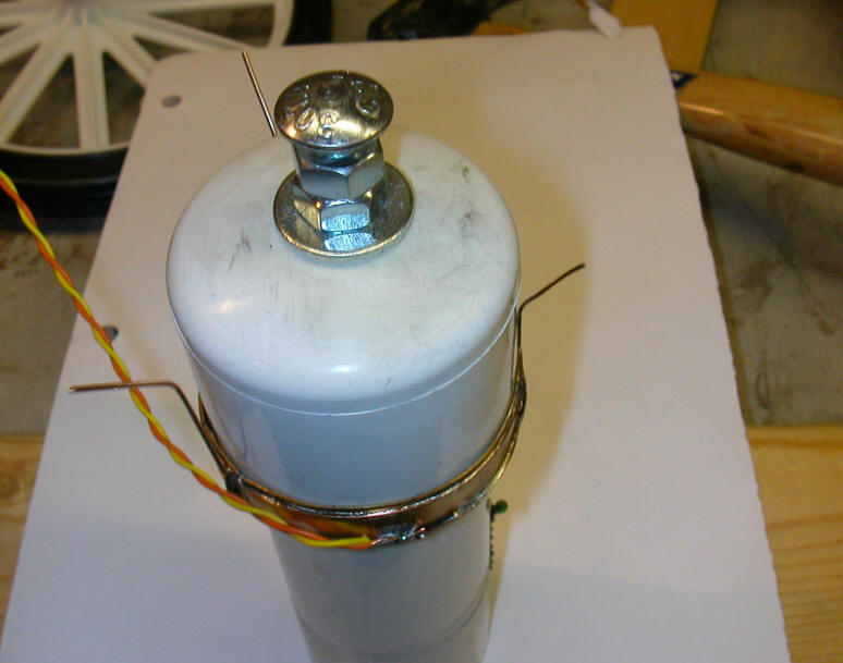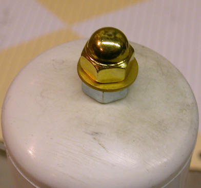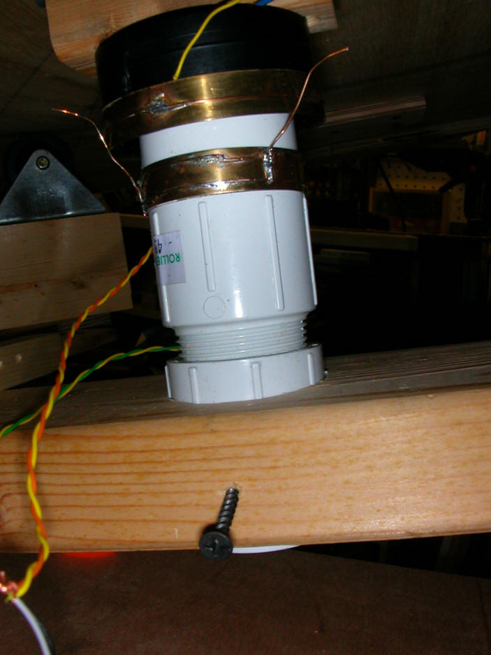 | Electrical Pickups The carriage bolt and 1/2" pipe cap work well for one of the two needed electrical connections. The next design for the second contact involves placing a brass ring around the plastic pipe cap at the top of the center support.